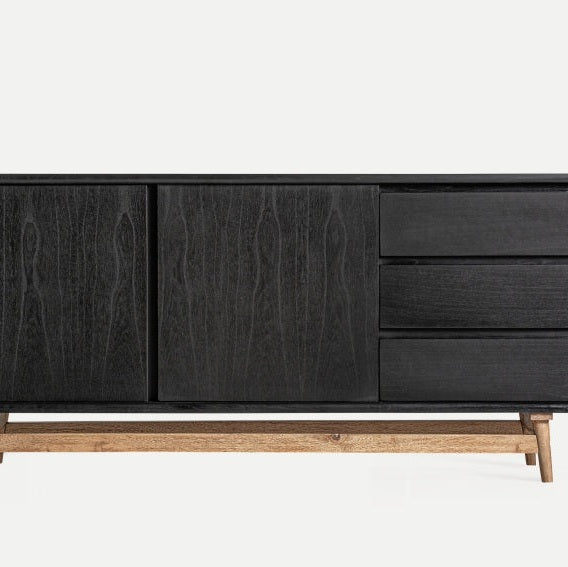 Fabricado en madera mindi, cada parte del aparador Thiers demuestra durabilidad y resistencia. El elegante acabado en negro le confiere un aire sofisticado, mientras que la base de madera natural complementa el conjunto con un contraste armónico que refuerza su estilo nórdico y moderno. Este aparador es ideal para los que buscan un mueble que destaque por su calidad y estética.