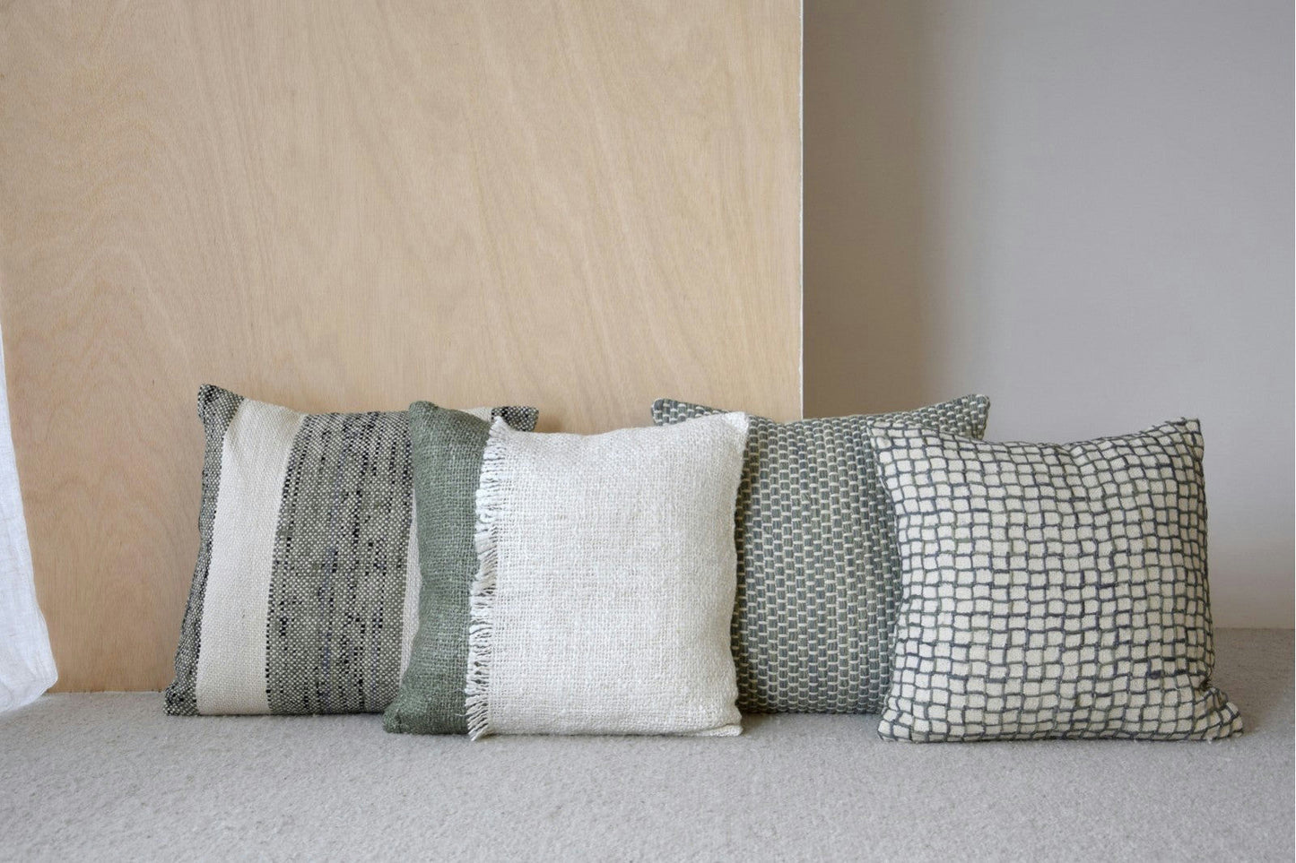 Fabricado con algodón 100% de calidad superior, este cojín presenta un diseño contemporáneo en tonos de verde, gris y ocre. Su entramado de red es un testimonio de la atención al detalle y la excelencia en la fabricación, garantizando durabilidad y una textura suave al tacto.