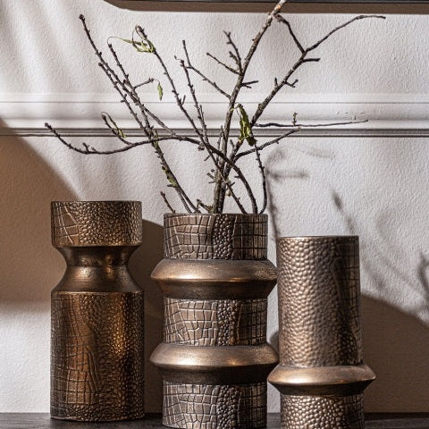 Construido en hierro, este jarrón garantiza durabilidad y un acabado de alta calidad. Su tono dorado antiguo realza el esplendor de su construcción artesanal, donde cada pieza es única. Ligero y fácil de mover, proporciona la versatilidad que necesitas para experimentar con la decoración de tus espacios.