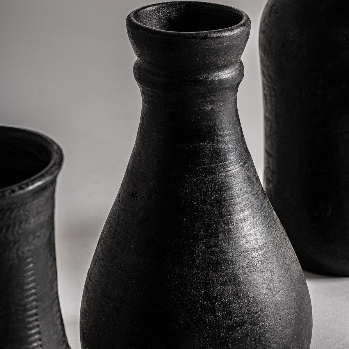Fabricados con terracota de alta calidad, estos jarrones ostentan un acabado negro mate que exuda elegancia en cualquier rincón. La variación artesanal en altura y textura asegura que cada pieza sea un testimonio de individualidad y cuidado en su elaboración. La solidez de la terracota garantiza durabilidad y un peso sustancial, aportando la sensación de una pieza significativa y bien construida.