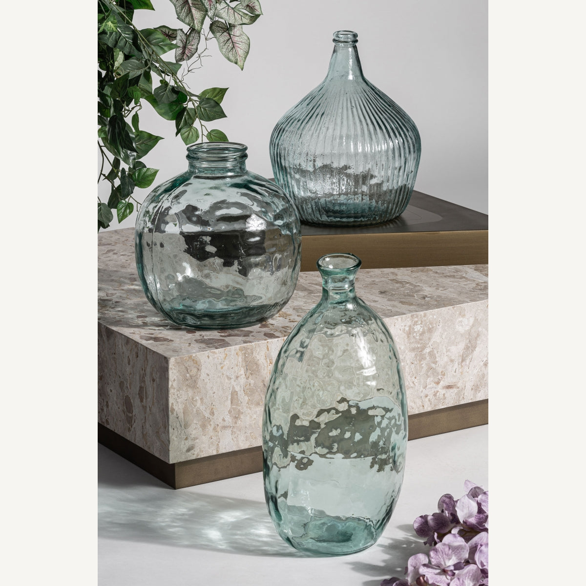 El Jarrón Sumaya destaca por su vidrio reciclado en un tono transparente que capta y refleja la luz de manera sutil y encantadora. Este acabado, junto a sus líneas clásicas, aporta un carácter único y distinguido a cada pieza, haciéndola resistente, estable y adecuada para decoraciones contemporáneas o rústicas. La durabilidad del vidrio y su acabado liso aseguran que este jarrón perdure como una pieza central en tu hogar.