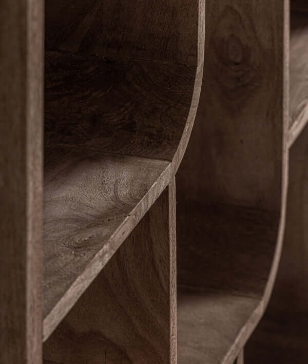 Fabricada artesanalmente en madera de mango, FLOW destaca por su estructura sólida y su ligereza visual. El acabado marrón realza la textura natural de la madera, transmitiendo una calidez genuina y aportando carácter a cualquier estancia. Cada estantería es única, resultado de un proceso manual que cuida cada detalle y convierte a FLOW en mucho más que un simple mueble: es una pieza exclusiva, pensada para perdurar y dialogar con el entorno.