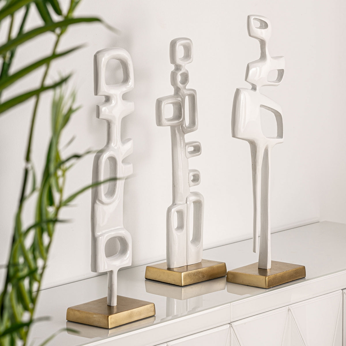 Fabricada en aluminio blanco con detalles dorados, la figura combina resistencia y ligereza. El acabado liso proporciona un tacto suave a la vez que su durabilidad garantiza una extensa vida útil. Los detalles dorados no solo añaden contraste sino que resaltan su diseño geométrico, creando una simbiosis estética perfecta.