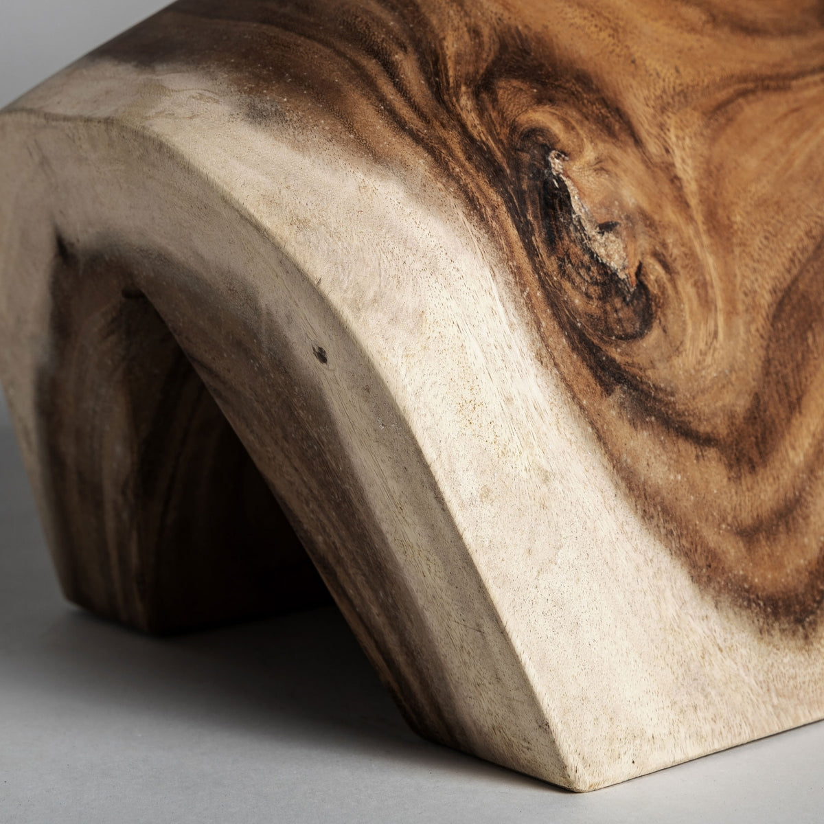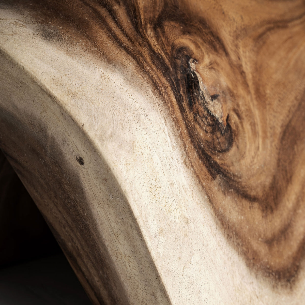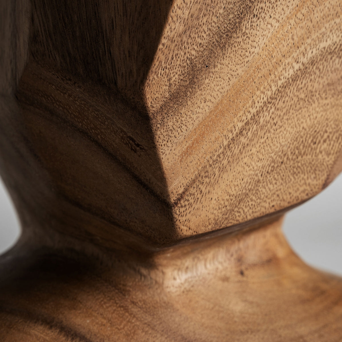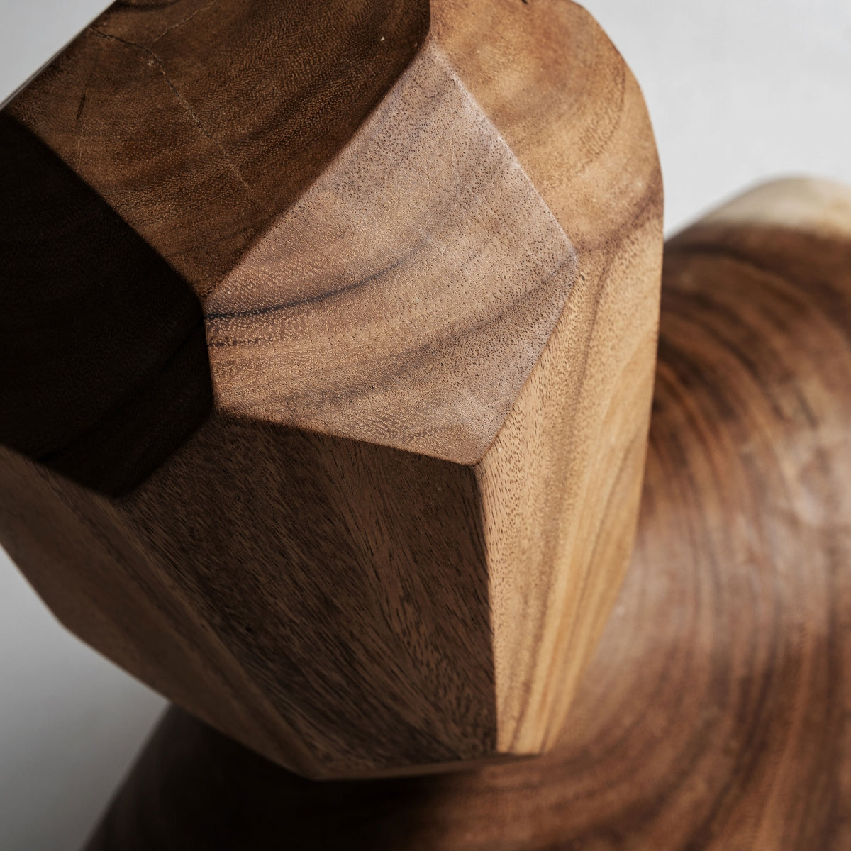Confeccionada en madera suar, esta figura destaca por sus tonos marrones naturales que transmiten calidez y naturalidad. La elección de este material no solo asegura su durabilidad, sino también una apariencia rústica y sofisticada gracias a los detalles artesanales que incluyen grietas y nudos propios de la madera. Cada pieza es inigualable, asegurando una decoración única que perdurará a lo largo de los años.