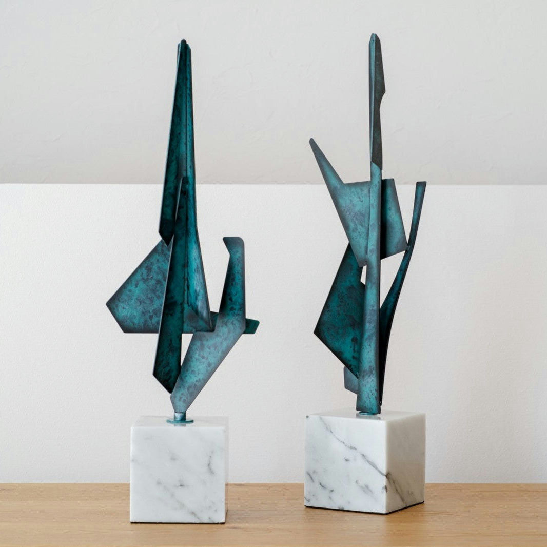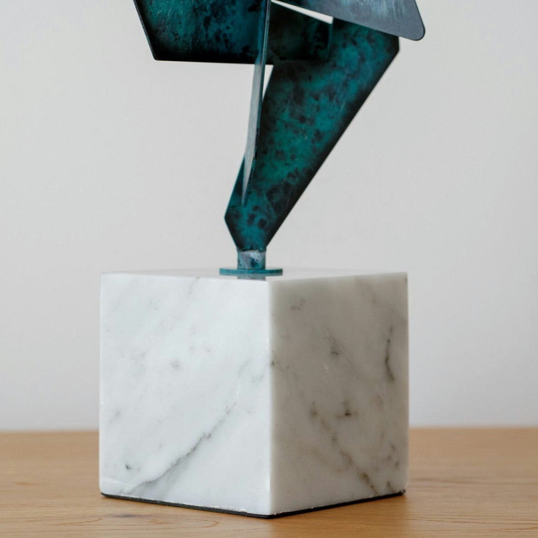 Realizada en metal, la escultura destaca por su acabado en tonos verde y azul que simulan el movimiento del agua en su superficie. El uso de materiales nobles, como la base de mármol blanco con elegantes vetas grises, garantiza no solo su durabilidad, sino también su atractivo visual, asegurando una presencia sofisticada sin sacrificar estabilidad.