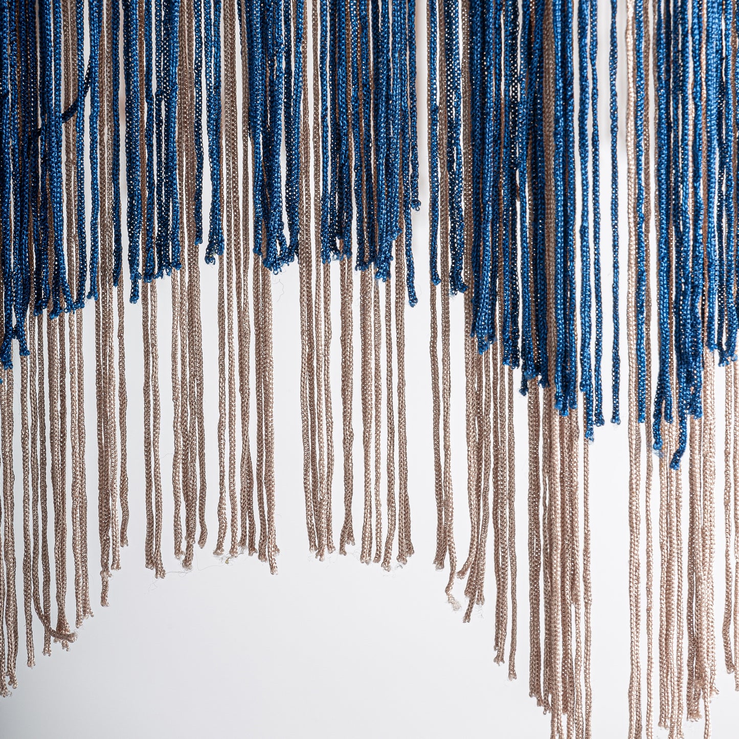 Elaborada artesanalmente, combina la calidez natural del yute beige con la modernidad del acrílico azul y la solidez del hierro marrón. Esta fusión de materiales no solo realza la sofisticación de la lámpara, sino que garantiza durabilidad y resistencia, manteniendo el equilibrio entre funcionalidad y estética boho chic. Los flecos, cuidadosamente tejidos, aportan una riqueza visual que invita al tacto y al bienestar, mientras su estructura metálica asegura una presencia ligera y robusta.
