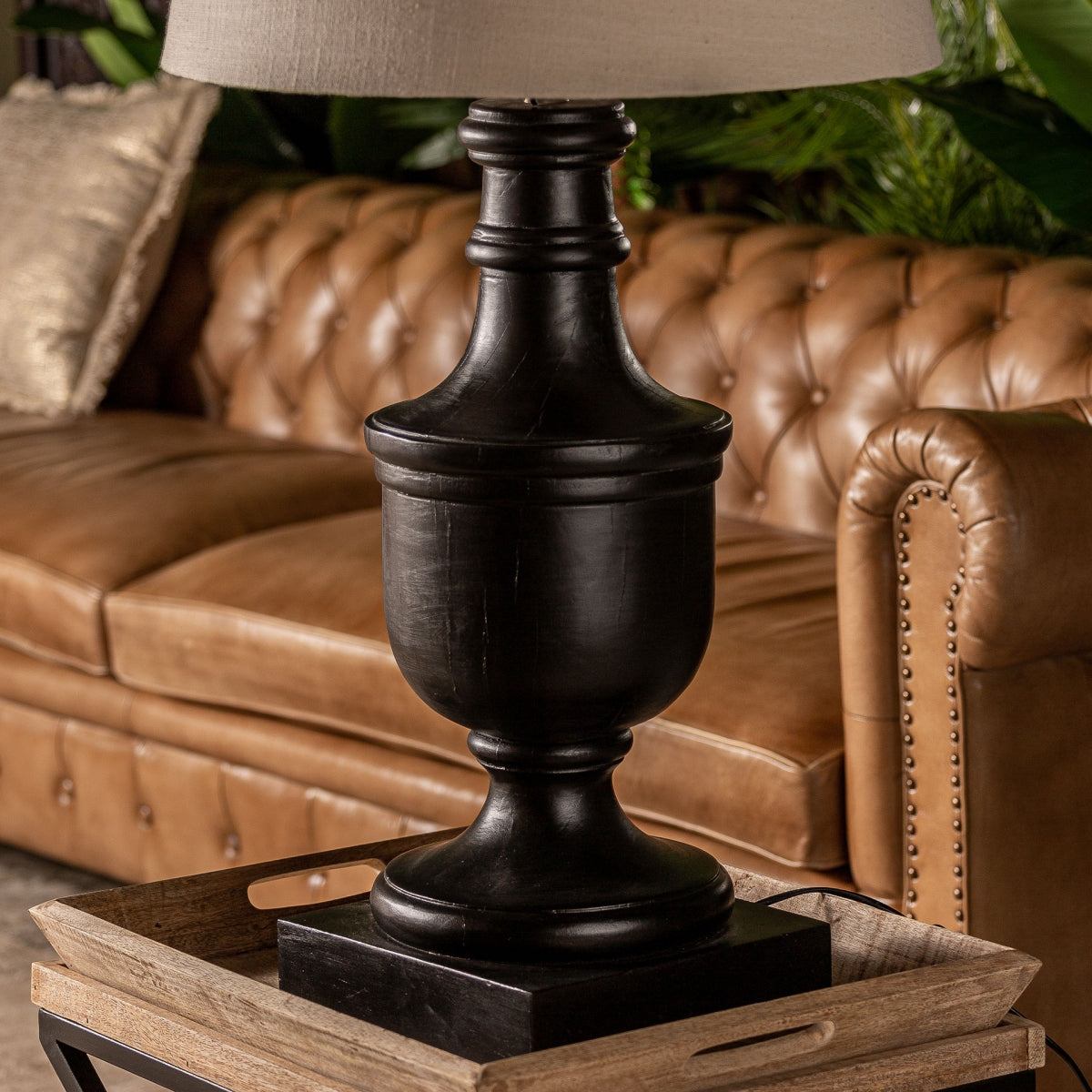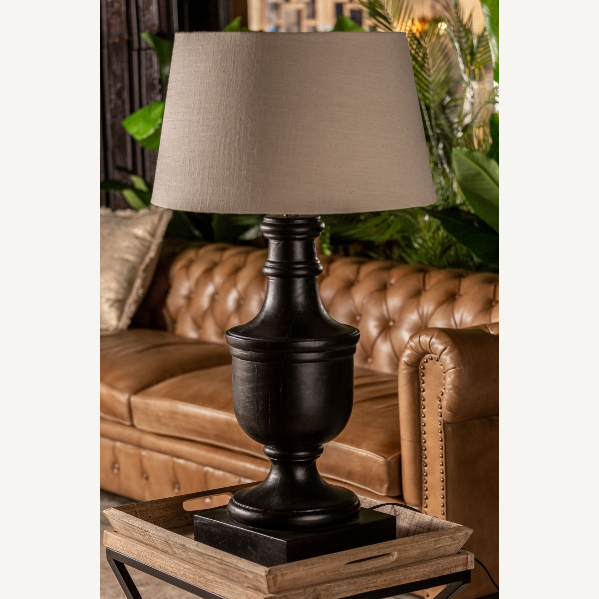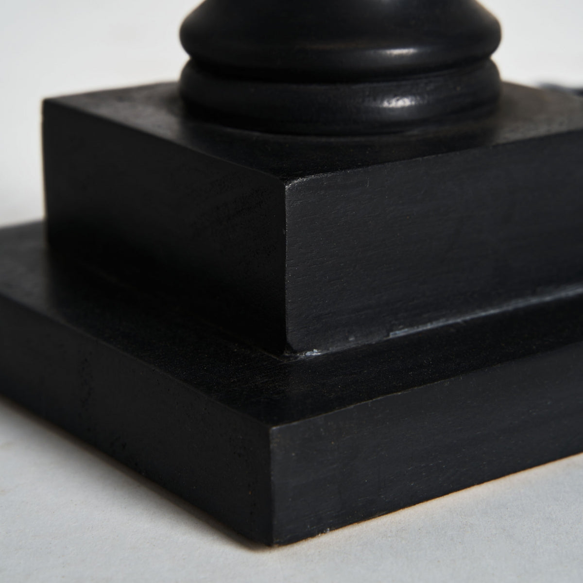 Fabricada artesanalmente en madera de mango negra, conocida por su resistencia y belleza única, esta lámpara atrae miradas por sus variaciones naturales que la convierten en una pieza exclusiva. Complementada con una pantalla de algodón suave, asegura una iluminación homogénea y delicada, ideal para crear ambientes agradables.