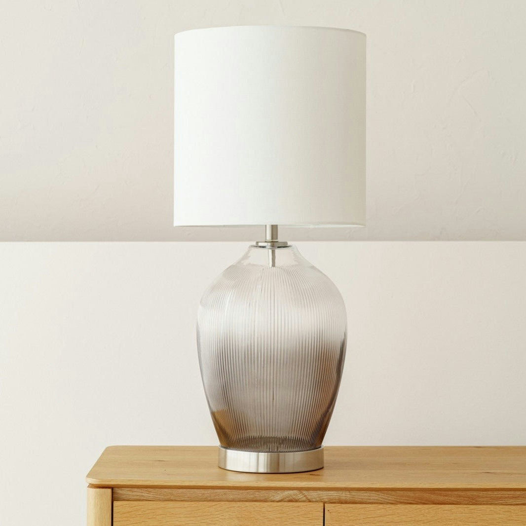 Fabricada a partir de una base de vidrio gris ahumado, la Lámpara ARC destaca por su construcción robusta y estética moderna. El acabado en níquel mate del metal añade sofisticación, mientras que su pantalla de lino blanco suaviza la iluminación. Estos materiales no solo aportan belleza, sino también durabilidad, asegurando que te acompañará durante años.