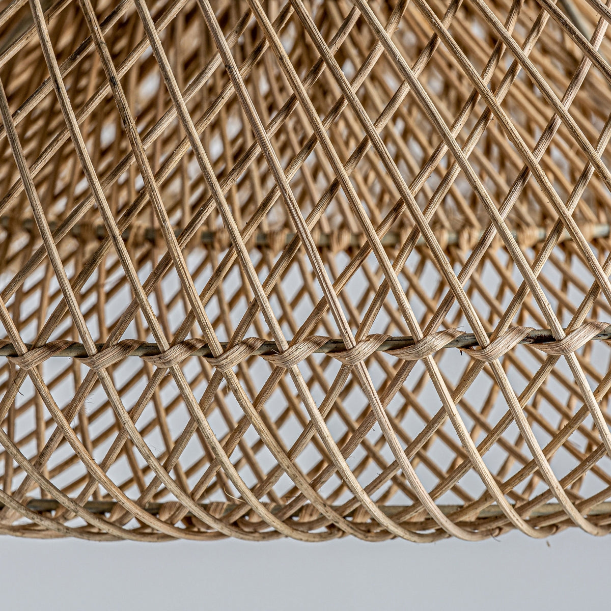 El ratán, material principal de esta lámpara, es conocido por su resistencia y ligereza. Su estructura en color marrón no solo es duradera, sino que también añade un toque artesanal y cálido. El acabado envolvente de la lámpara asegura una difusión homogénea de la luz, creando atmósferas acogedoras en cualquier habitación donde se instale.