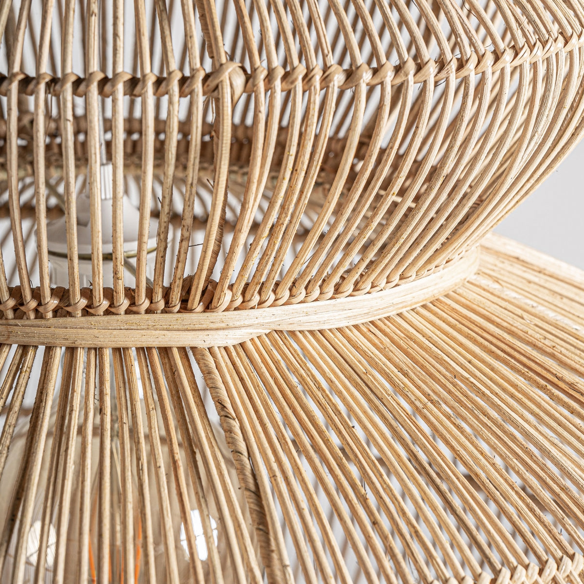 Confeccionada completamente en ratán de color marrón, esta lámpara se destaca por su durabilidad y diseño artesanal. Su acabado natural resalta la belleza del material, mientras su construcción ligera facilita la instalación y manipulación. El ratán es conocido por su resistencia, lo que asegura una larga vida útil y una apariencia siempre impecable.