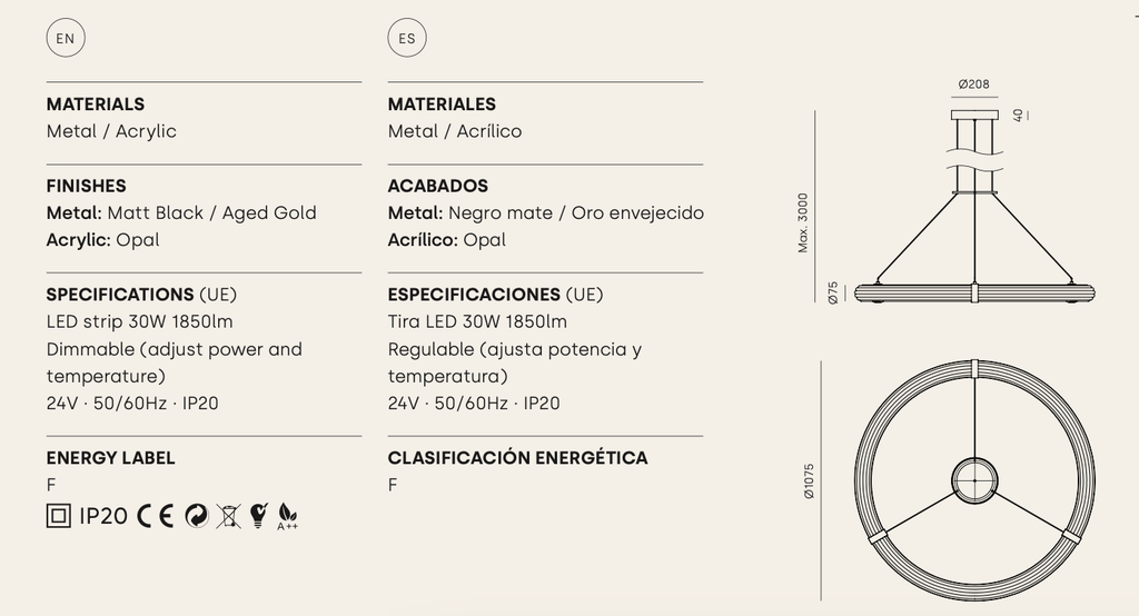 Fabricada con un robusto marco de metal y un difusor de acrílico opal, Elli se presenta en dos elegantes acabados: negro mate y oro envejecido. Su estructura en forma de anillo destaca por su durabilidad y capacidad de resistir el desgaste diario, asegurando una inversión a largo plazo en calidad y diseño.