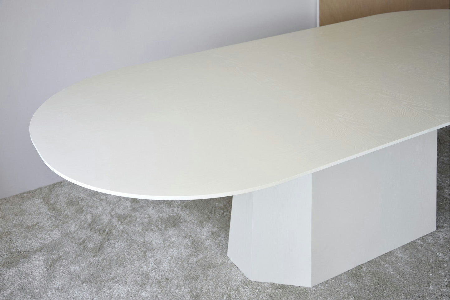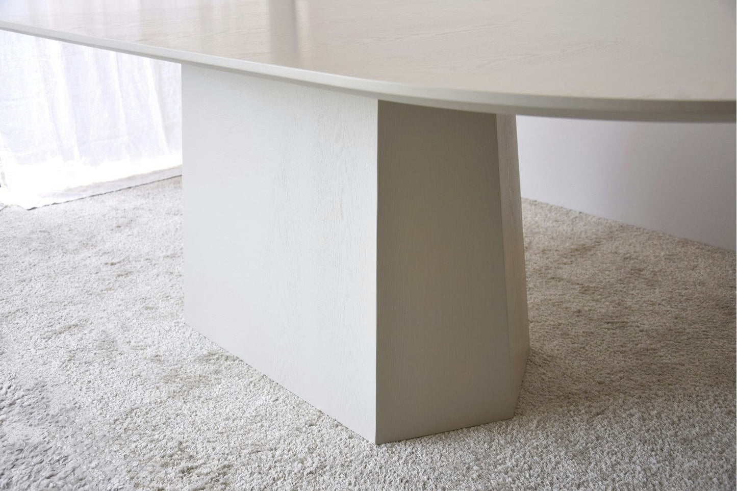 Confeccionada en DM rechapado en fresno natural, esta mesa destaca por su durabilidad y calidad. El acabado en blanco cálido mate resalta las vetas de la madera, dispuestas en ingeniosas direcciones que crean un efecto visual atractivo. La base robusta y facetada no solo fortalece su estabilidad, sino que también añade un elemento de diseño que captura la atención.