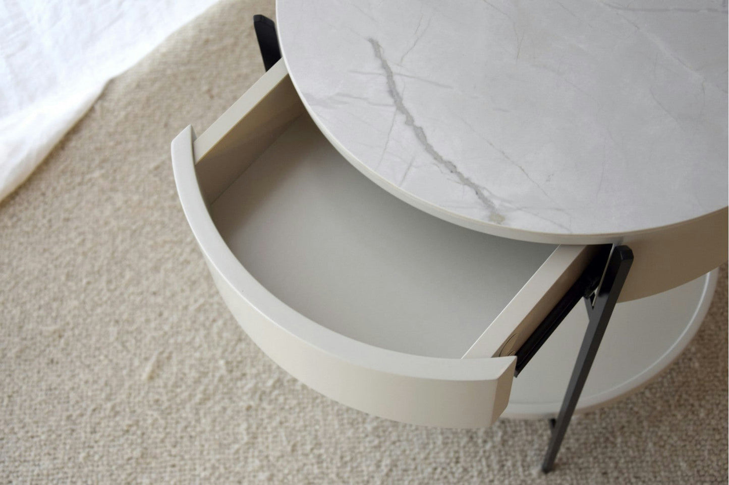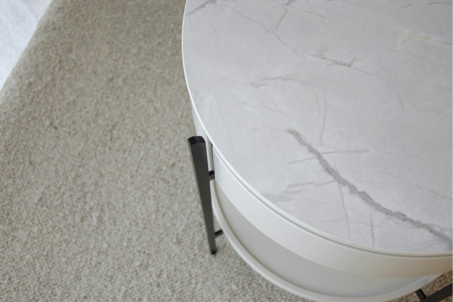El mármol cerámico que compone su superficie se destaca con tonos blancos, combinando elegancia y durabilidad. Sus propiedades de resistencia a manchas y arañazos aseguran una larga vida útil, mientras que el soporte de DM lacado en un sofisticado gris arena ofrece estabilidad y un acabado limpio. La estructura metálica negra de acabado mate complementa el conjunto, aportando modernidad y un aspecto sólido al diseño.
