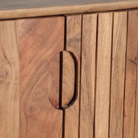 La calidad de los materiales de la Blesle se refleja en su acabado artesano, con bordes redondeados que añaden suavidad al diseño. La madera de acacia asegura una resistencia duradera y estabilidad, gracias a sus robustas patas inclinadas con tacos regulables, adaptándose a diferentes tipos de suelos sin perder firmeza. Este conjunto garantiza la integridad estructural del mueble y su longevidad.