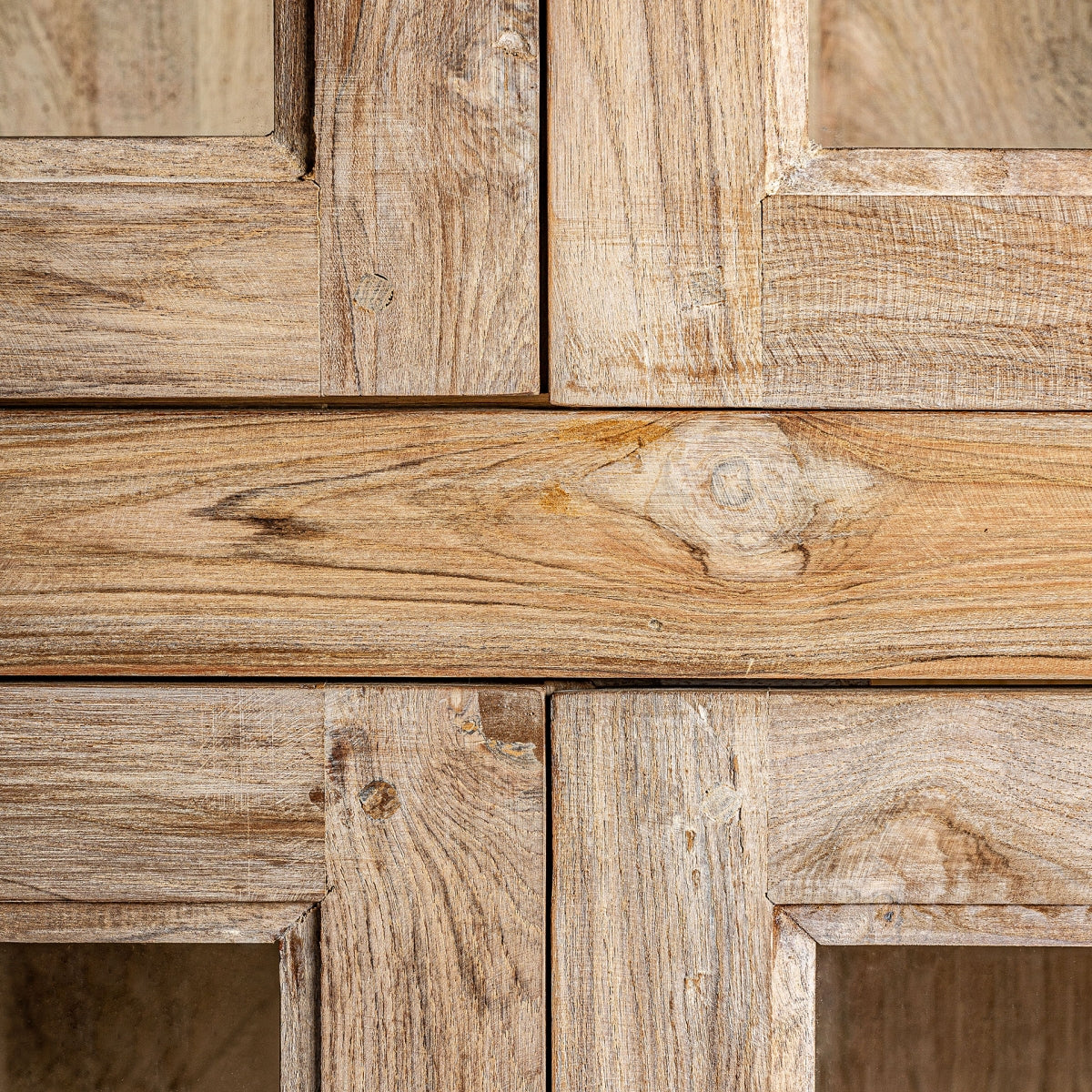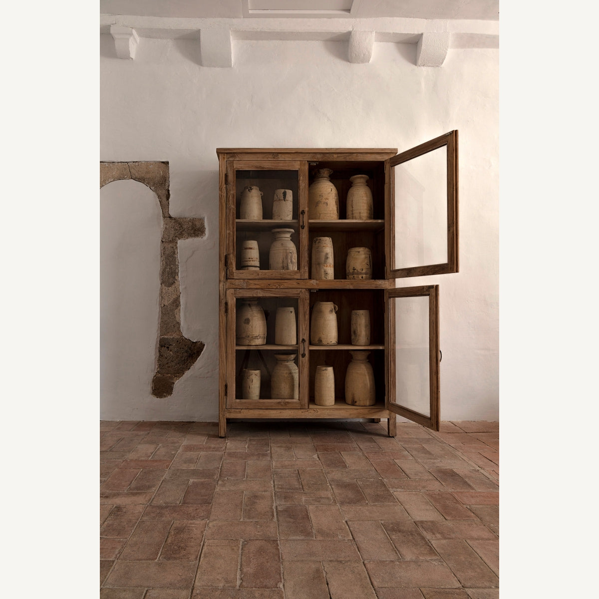 Elaborada en madera de mango reciclada, la Vitrina Carrik refleja un compromiso con la sostenibilidad y el respeto por el medio ambiente. Cada pieza, única por sus variaciones de color y pequeñas imperfecciones, es testimonio de una labor artesanal cuidada. La robustez de su estructura, acompañada de elegantes puertas de vidrio, subraya la calidad inigualable de este mueble.