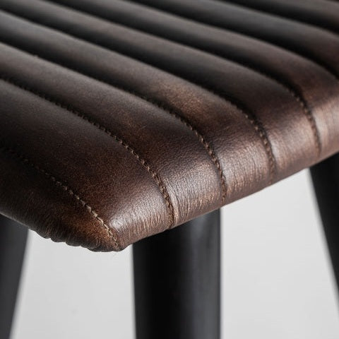La estructura de metal negro mate en forma de trípode aporta solidez visual y estabilidad. El asiento tapizado en piel marrón, con un discreto acolchado decorado con costuras lineales, proporciona una sensación de comodidad inmediata. La mezcla de materiales —metal, piel y madera— crea un equilibrio entre rusticidad y elegancia que se percibe tanto al sentarse como al observarlo.