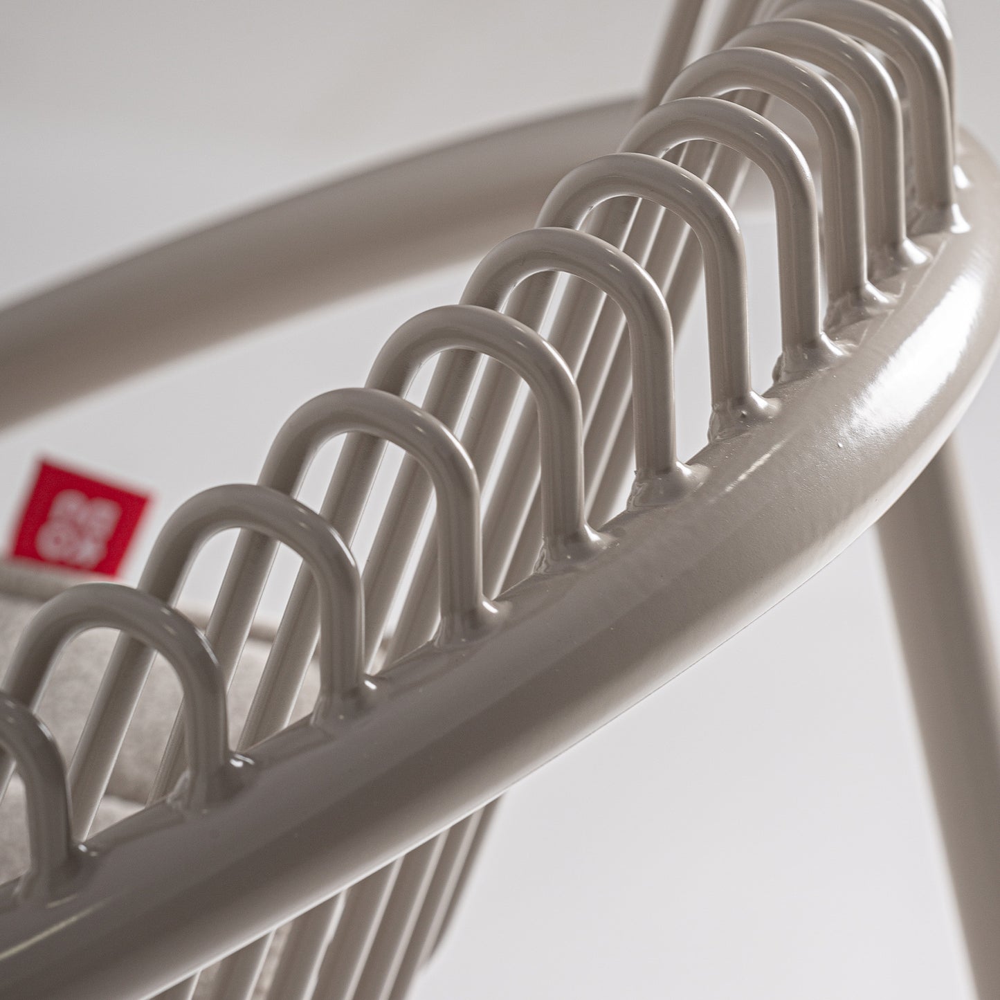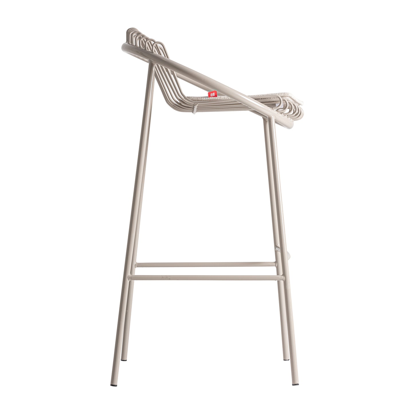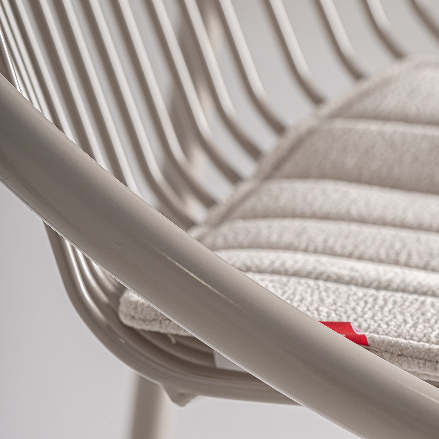 Su arquitectura se basa en una estructura sólida de hierro con acabado gris, trabajada en líneas limpias de sección cuadrada que garantizan estabilidad sin aportar peso visual. El asiento incorpora un cojín de poliéster técnico en el mismo tono, de tacto firme y alta resistencia, asegurando confort mediante un diseño desmontable y práctico. Es una pieza donde la robustez del metal dialoga con la suavidad textil, creando una silueta que soporta el uso intensivo sin perder su esencia refinada.