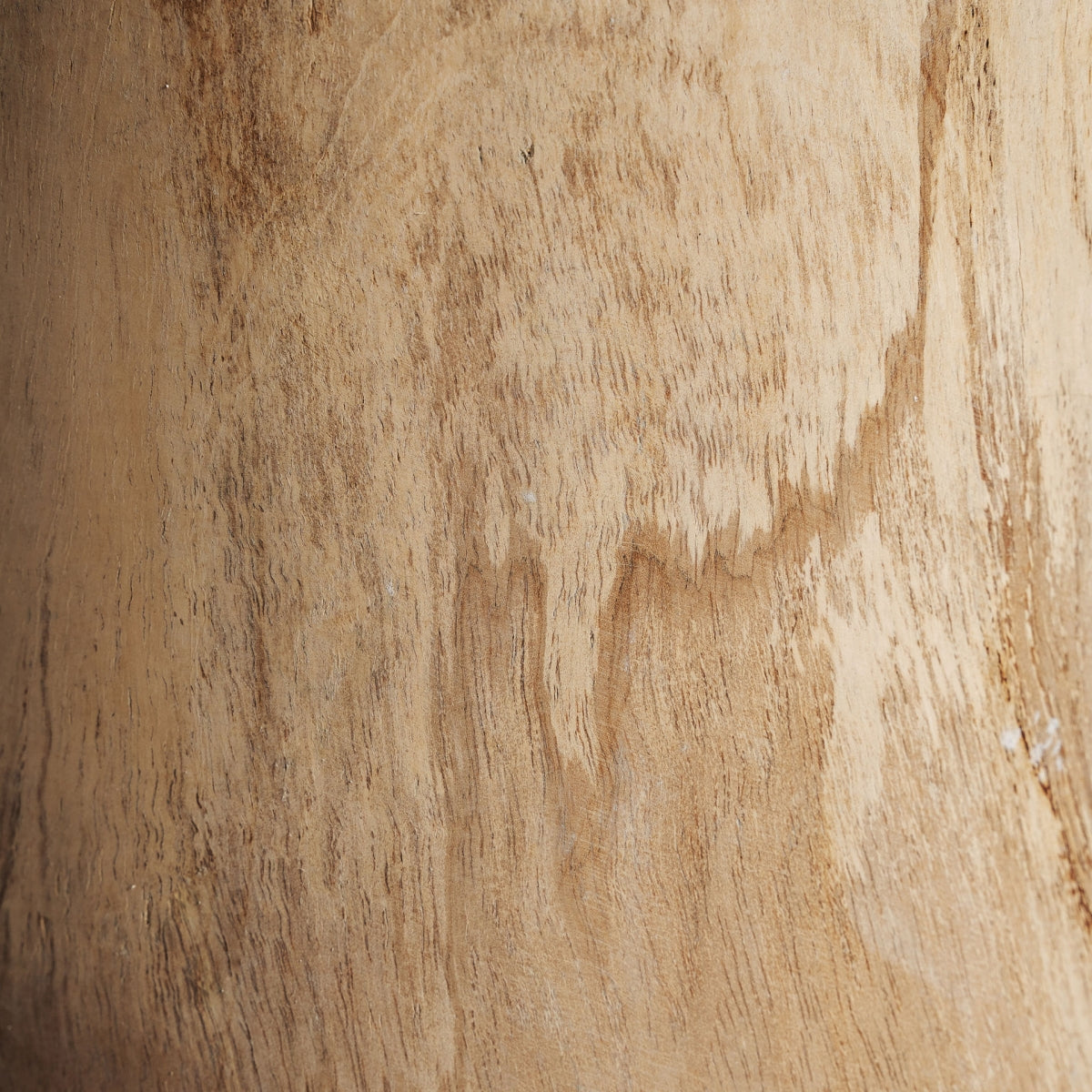 Fabricado en madera suar, el taburete muestra una superficie rica en vetas, tonos profundos y texturas naturales. Cada pieza es única, con ligeras variaciones en forma y color propias de su proceso artesanal. El acabado en marrón natural resalta la belleza bruta del material, aportando una presencia sobria y cálida en cualquier estancia. La madera suar no solo destaca por su estética; también es conocida por su resistencia estructural, lo que garantiza estabilidad y durabilidad a largo plazo.