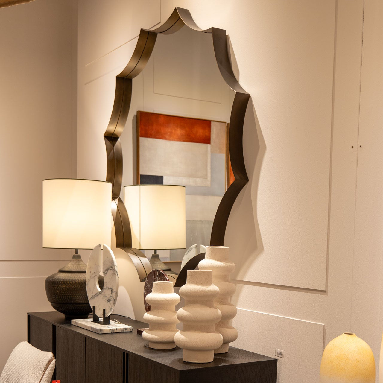 El Espejo Redondo 1 presenta un marco de metal semicircular de latón envejecido, que refleja una cortina blanca.