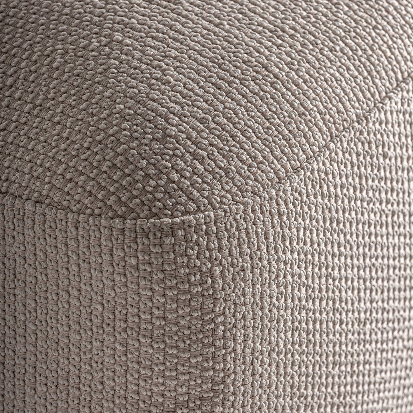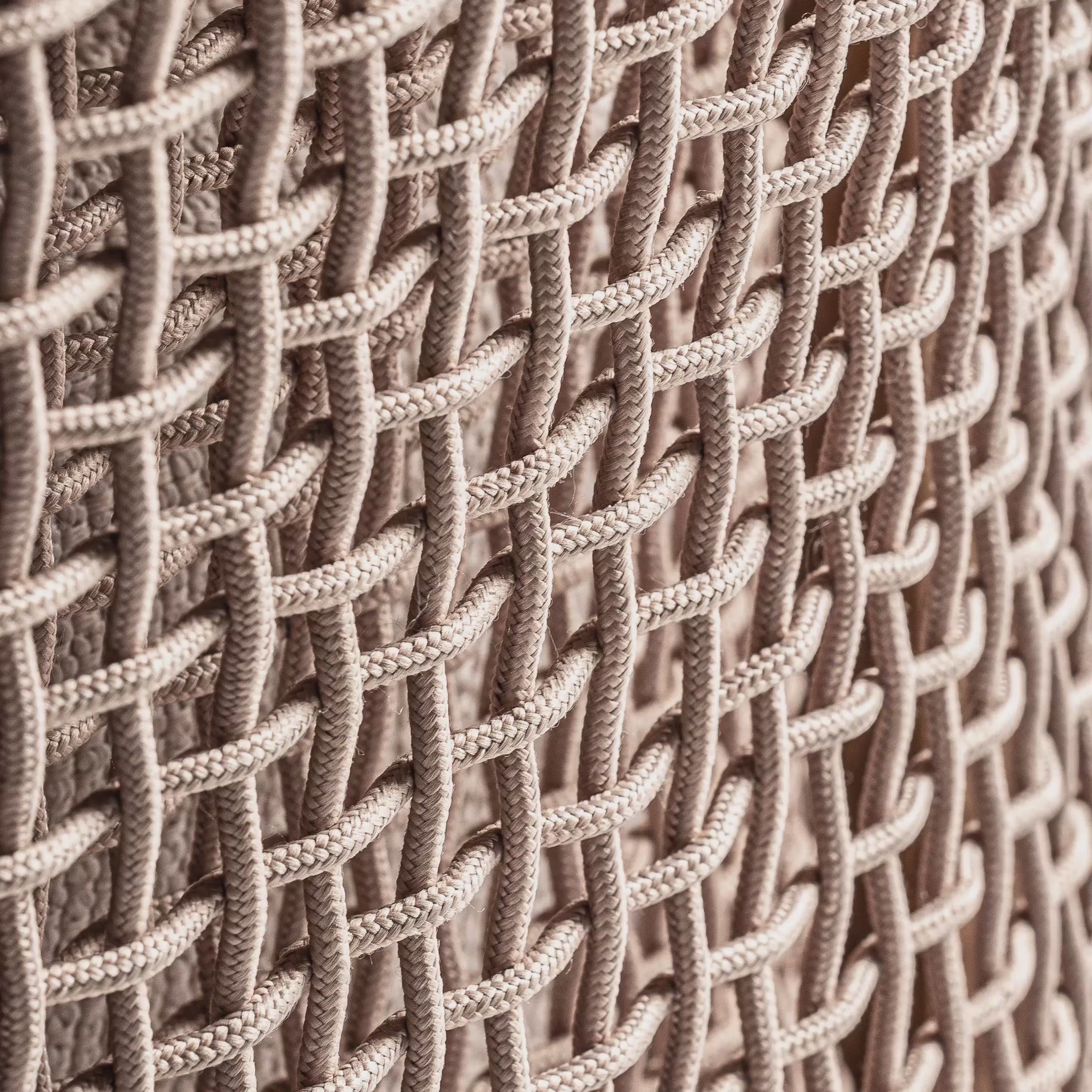 La estructura descansa sobre una sólida tarima de madera de teca reciclada en cálido marrón, un material conocido por su durabilidad natural frente al clima y su compromiso sostenible. El respaldo, realizado en cuerda beige de polipropileno reciclado resistente al agua, abraza el conjunto y potencia la sensación de protección y ligereza. La tapicería hidrófuga y la espuma de la serie S. garantizan confort prolongado y fácil mantenimiento, asegurando calidad y bienestar con cada uso.
