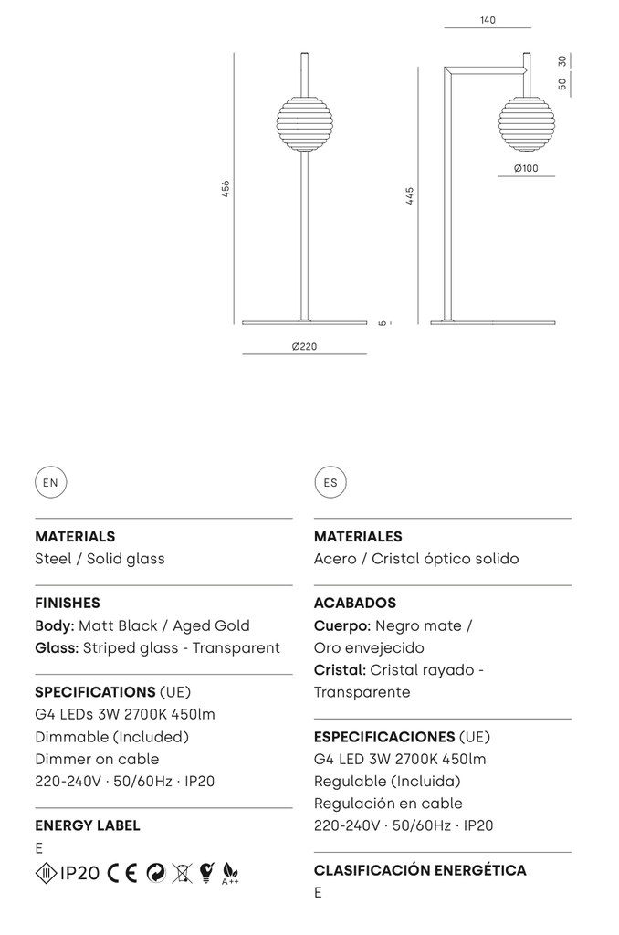 Para mantener tu lámpara en perfectas condiciones, limpia el cuerpo metálico con un paño seco y el cristal con un limpiador específico para vidrio. Evita los productos abrasivos para preservar su exclusivo acabado.