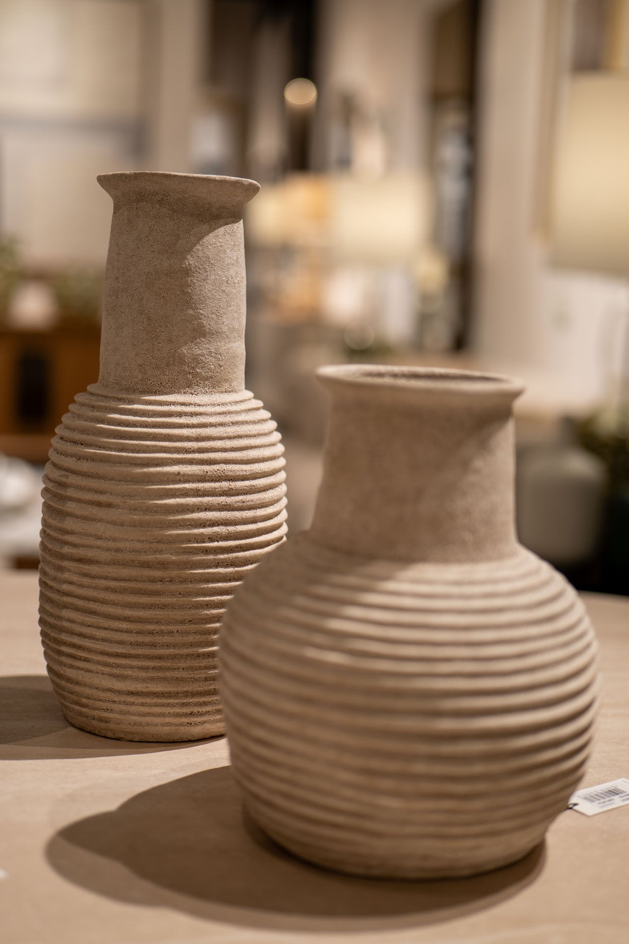 Estos jarrones están elaborados en cerámica de alta calidad, presentando un tono topo arena que se adapta a una variedad de estilos. La base con relieve acanalado horizontal y la parte superior alargada de forma cilíndrica enfatizan su carácter artesanal, asegurando un acabado duradero que resiste el paso del tiempo. Cada jarrón es una pieza única gracias a las variaciones de textura que son resultado de su producción manual.
