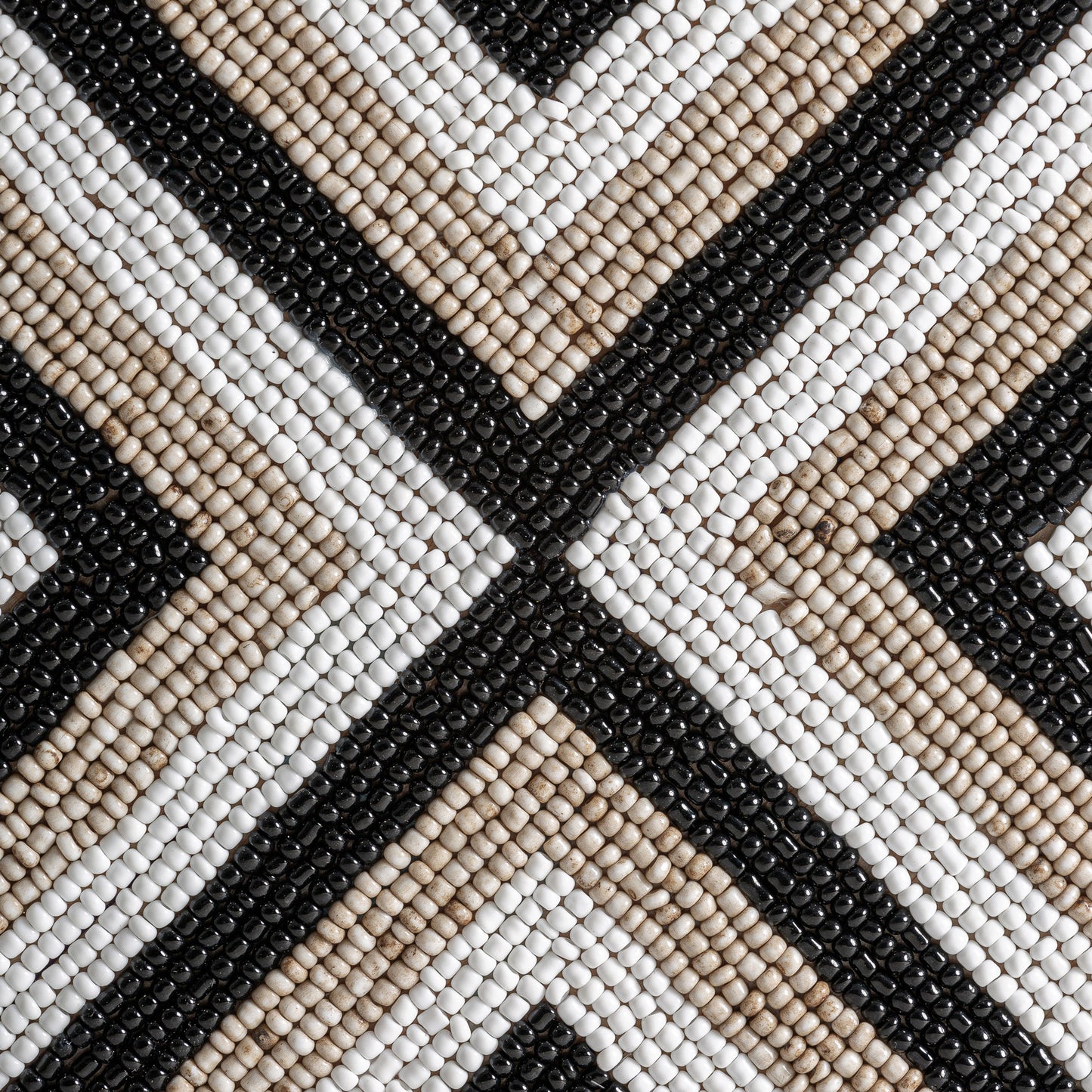 Lejos de ser un simple adorno, esta pieza es un estudio de materialidad. El cuerpo principal, elaborado en fibras de bambú de tonalidades neutras, ofrece una calidez táctil inmediata y una trama viva que respira. Sobre este lienzo natural, el patrón geométrico en zigzag juega con el contraste visual, mientras que los detalles de pequeñas conchas en el borde aportan una nota artesanal y ancestral, casi como un hallazgo de viaje. La estructura se sostiene sobre una base de hierro negro sólido, cuyo acabado mate y líneas depuradas otorgan la estabilidad y la fuerza industrial necesarias para enmarcar la delicadeza de los elementos naturales.