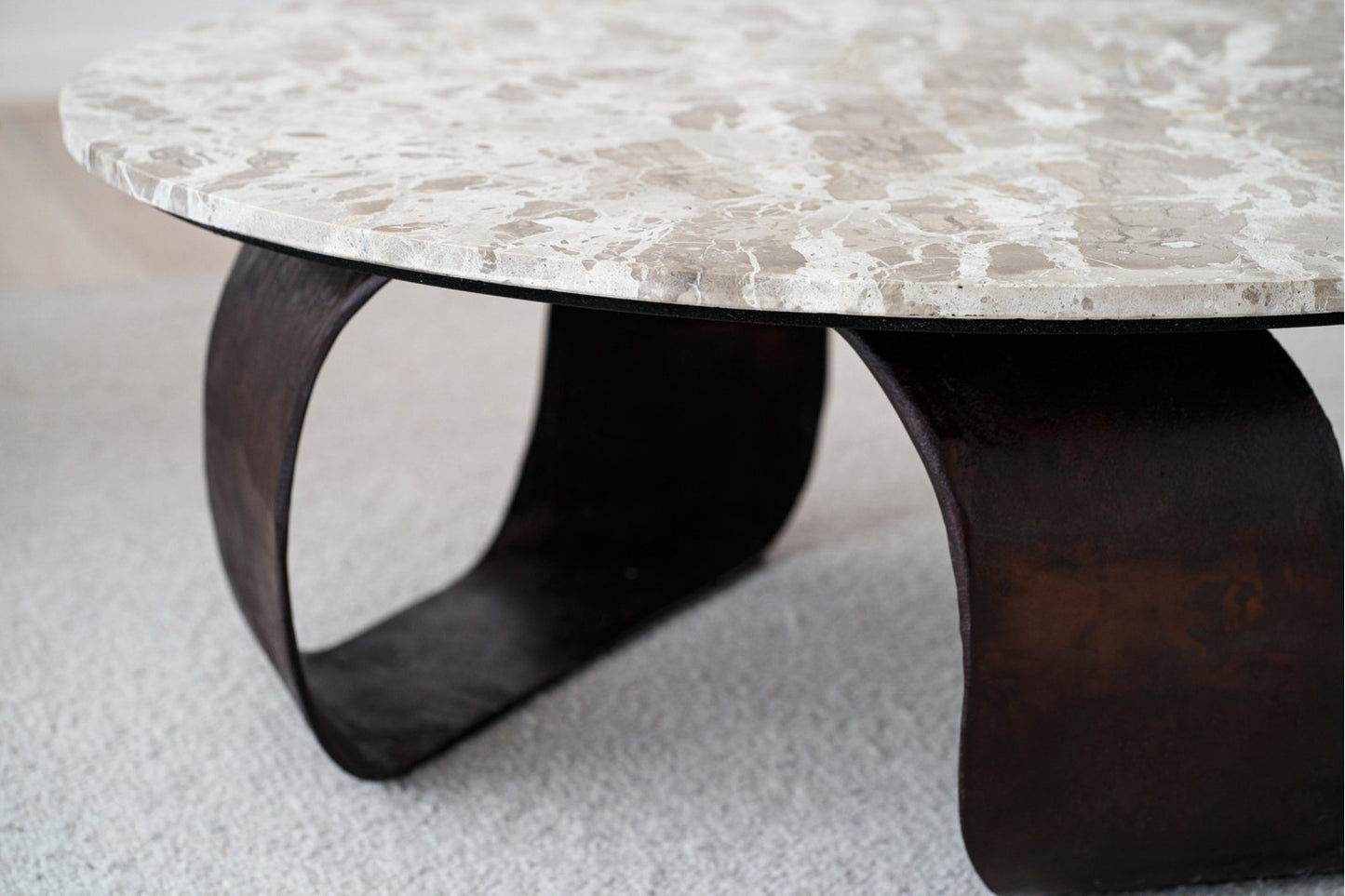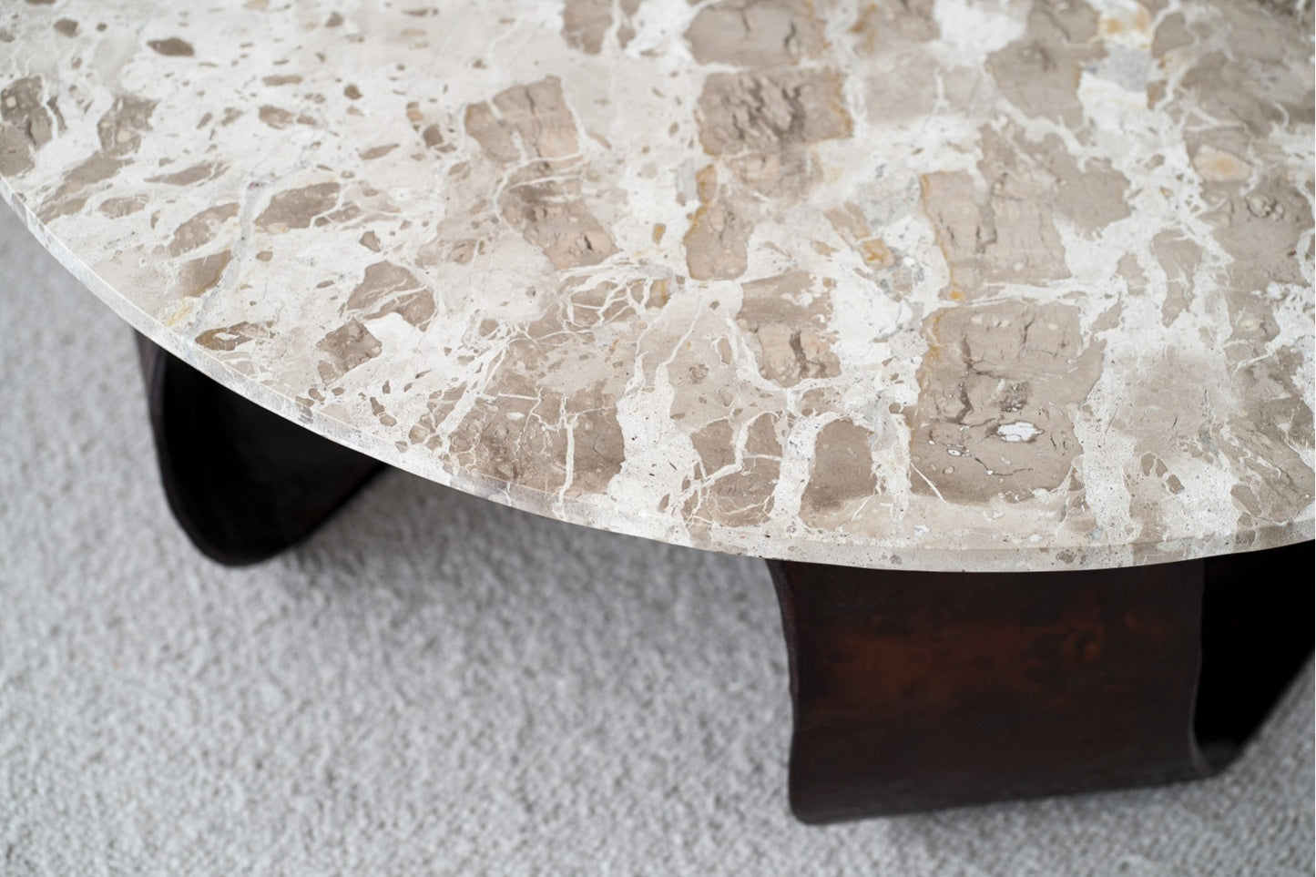 La tapa, elaborada en mármol natural en tonos beige arena y blanco, transmite una sensación de pureza y autenticidad que sólo los materiales nobles pueden ofrecer. Cada veta y detalle es único, testimonio de la belleza inimitable de la piedra natural. La base escultórica de metal con acabado óxido realza la esencia artesanal de la mesa, aportando calidez y una presencia envolvente. El contraste entre la superficie pulida y la estructura orgánica dota a MAYA de un carácter singular, pensado para quienes valoran la calidad sin ostentaciones y buscan soluciones duraderas para espacios modernos o eclécticos.