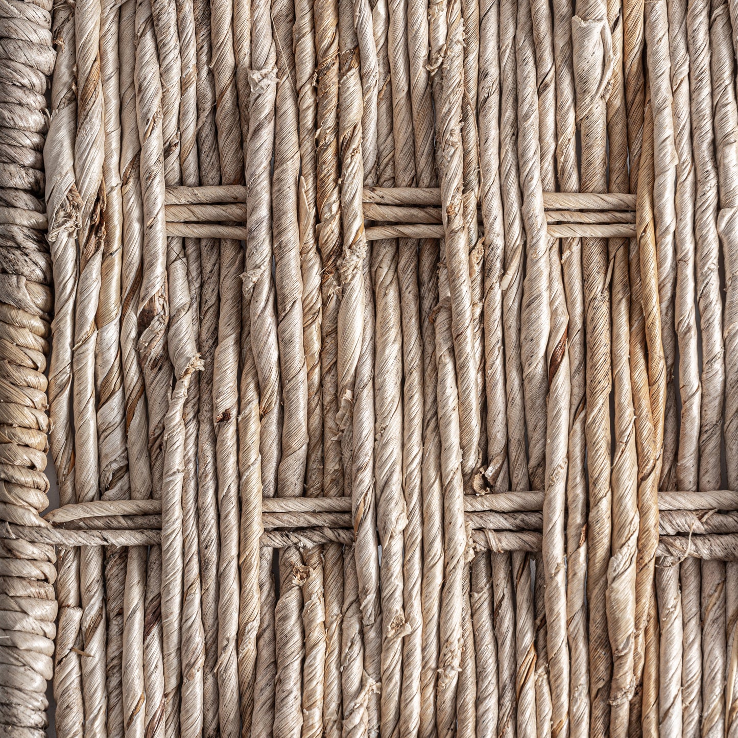 La esencia de esta pieza reside en la honestidad de sus componentes. El tejido principal es una trama de fibra de banano en tono arena, seleccionada por su calidez táctil y su capacidad para matizar la luz de forma irregular y bella. Esta piel vegetal descansa sobre una estructura interna de hierro que, aunque invisible a primera vista, otorga solidez y mantiene la geometría perfecta del cuadro sin añadir pesadez visual. Es un diálogo equilibrado entre la flexibilidad de la fibra natural y la firmeza del metal, resultando en una superficie con relieve y carácter artesanal.
