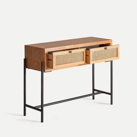 Elaborada con madera DM y un delicado entramado de ratán en sus cajones, la Zetel ofrece no solo belleza, sino también resistencia. Sus detalles en ratán aportan un toque cálido, mientras que sus patas metálicas negras añaden un estilo moderno e industrial. Esta combinación de materiales asegura una pieza de alta calidad que complementa cualquier decoración sofisticada.