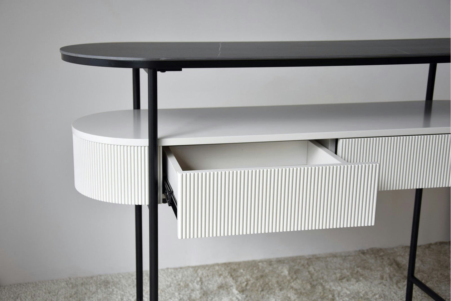 Ideal para el vestíbulo, sala de estar o comedor, su diseño versátil se adapta tanto a estéticas industriales como contemporáneas. Imagínala en tu recibidor, siendo la primera impresión que se llevan tus invitados, disponible también para almacenar discretamente en su cajón dedicado. Su versátil diseño ovalado encaja sin esfuerzo en cualquier ambiente, ofreciendo distinción y practicidad a partes iguales.