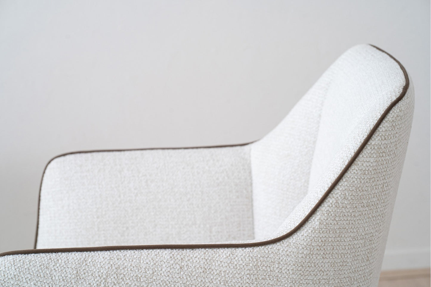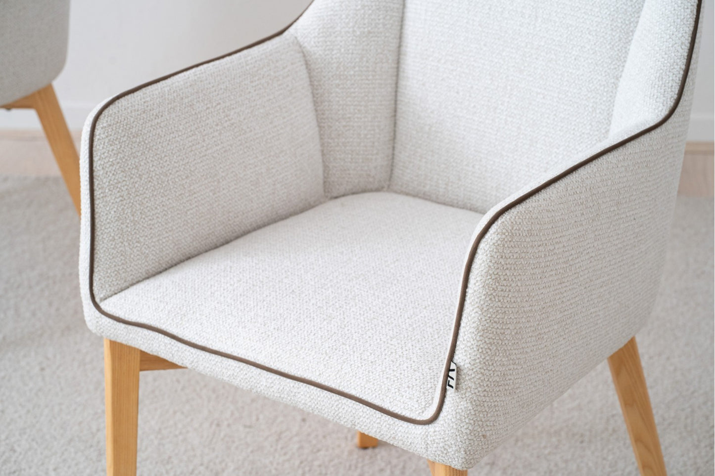 Estas sillas destacan por su tapizado en tejido color marfil, realzado por un ribete marrón que exuda elegancia. Las patas de madera maciza de roble aportan no solo un toque natural, sino también durabilidad y estabilidad. Este diseño asegura que las sillas sean una inversión a largo plazo, manteniendo su esplendor durante años.