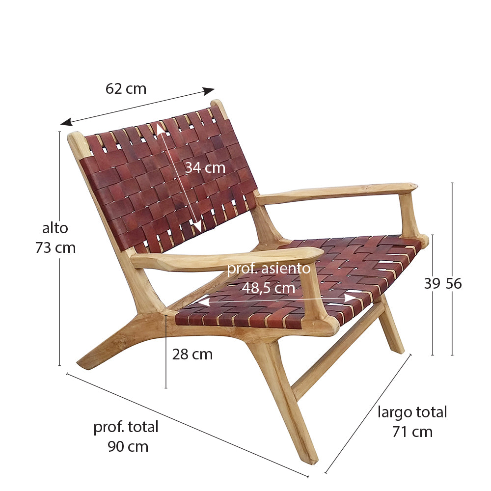 Mantener el esplendor del Sillón Zoe es sencillo. Para preservar su calidad, simplemente límpialo con un paño húmedo y, si deseas, aplica cera incolora para acentuar el brillo natural de la madera de teca, evitando productos químicos agresivos.