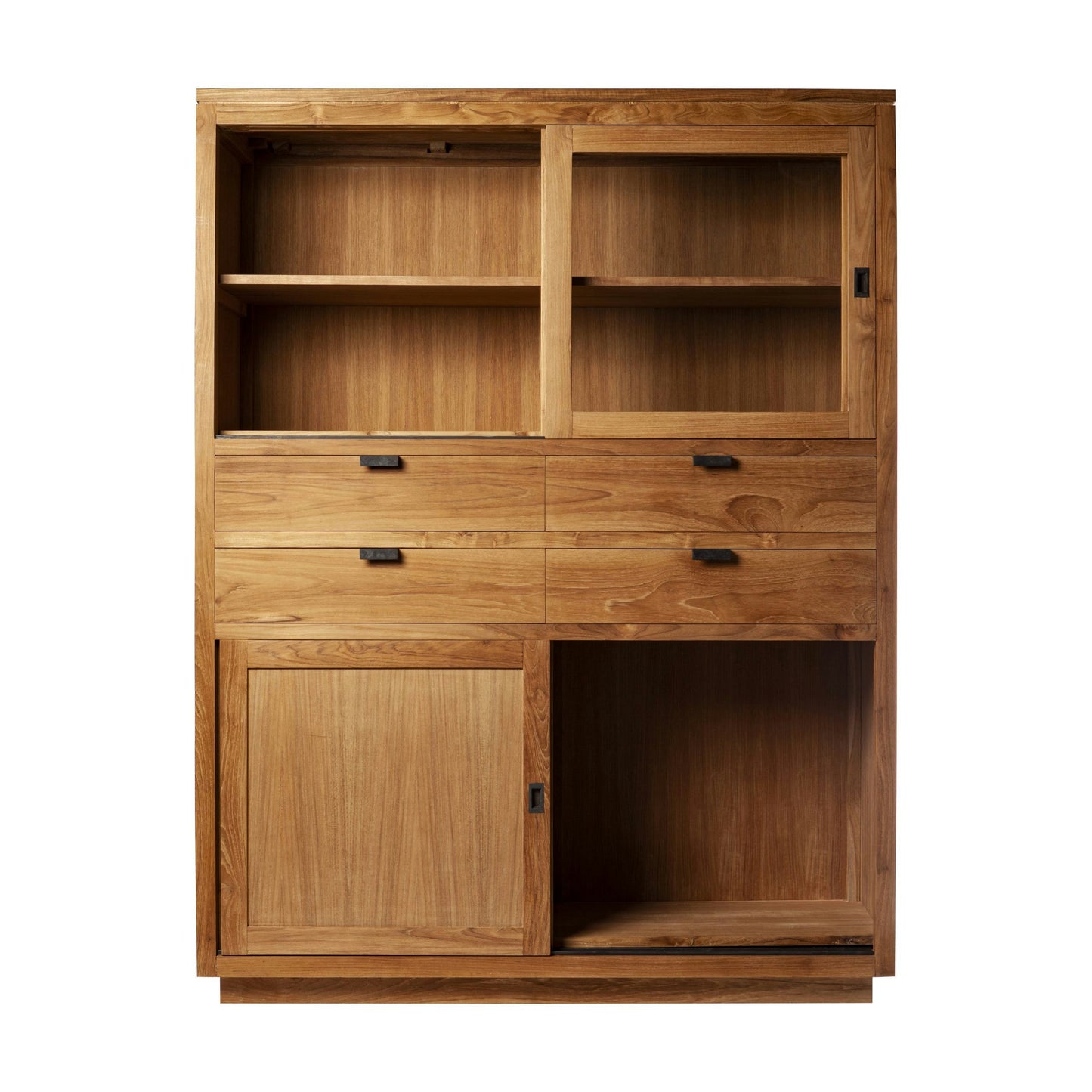 Construida en teca maciza, conocida por su extrema durabilidad y resistencia a la humedad, la Vitrina Gecko es sinónimo de calidad. Las vetas naturales de la madera junto a líneas limpias proporcionan un atractivo visual que se adapta a interiores contemporáneos, clásicos y rústicos. Sus tiradores metálicos oscuros contrastan exquisitamente con el cálido tono natural de la teca, asegurando que sea un mueble expositor elegante.