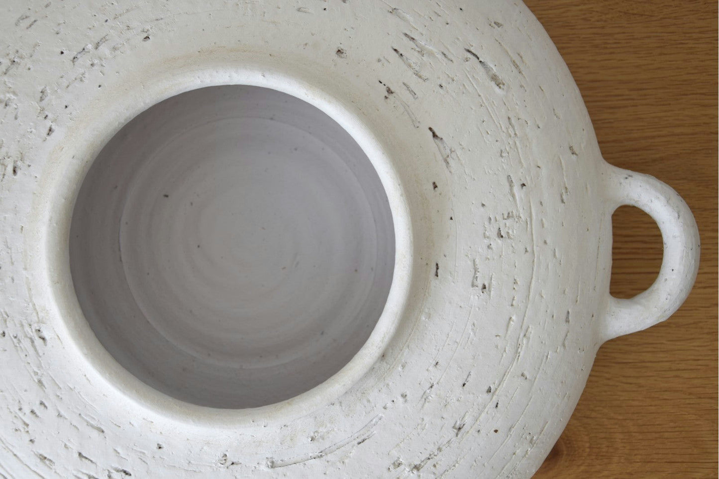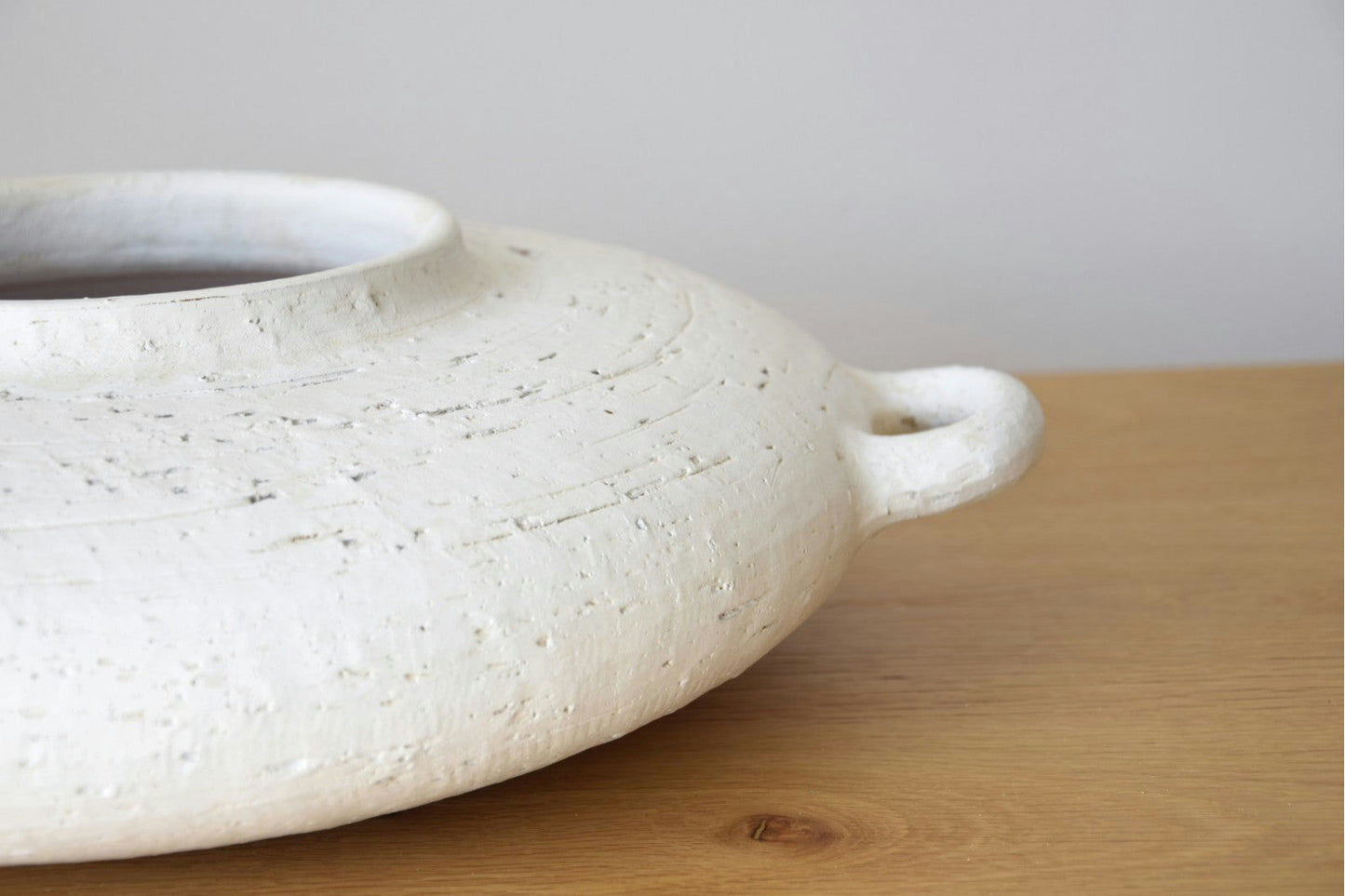 Fabricado en cerámica blanca, este centro de mesa presume un acabado mate singular inspirado en la belleza salvaje de las rocas volcánicas. La durabilidad del material asegura una larga vida útil, mientras que su construcción manual lo convierte en una pieza única. Cada aspereza y suavidad del acabado refleja la pasión y la precisión del trabajo artesanal, elevando la elegancia de cualquier entorno.