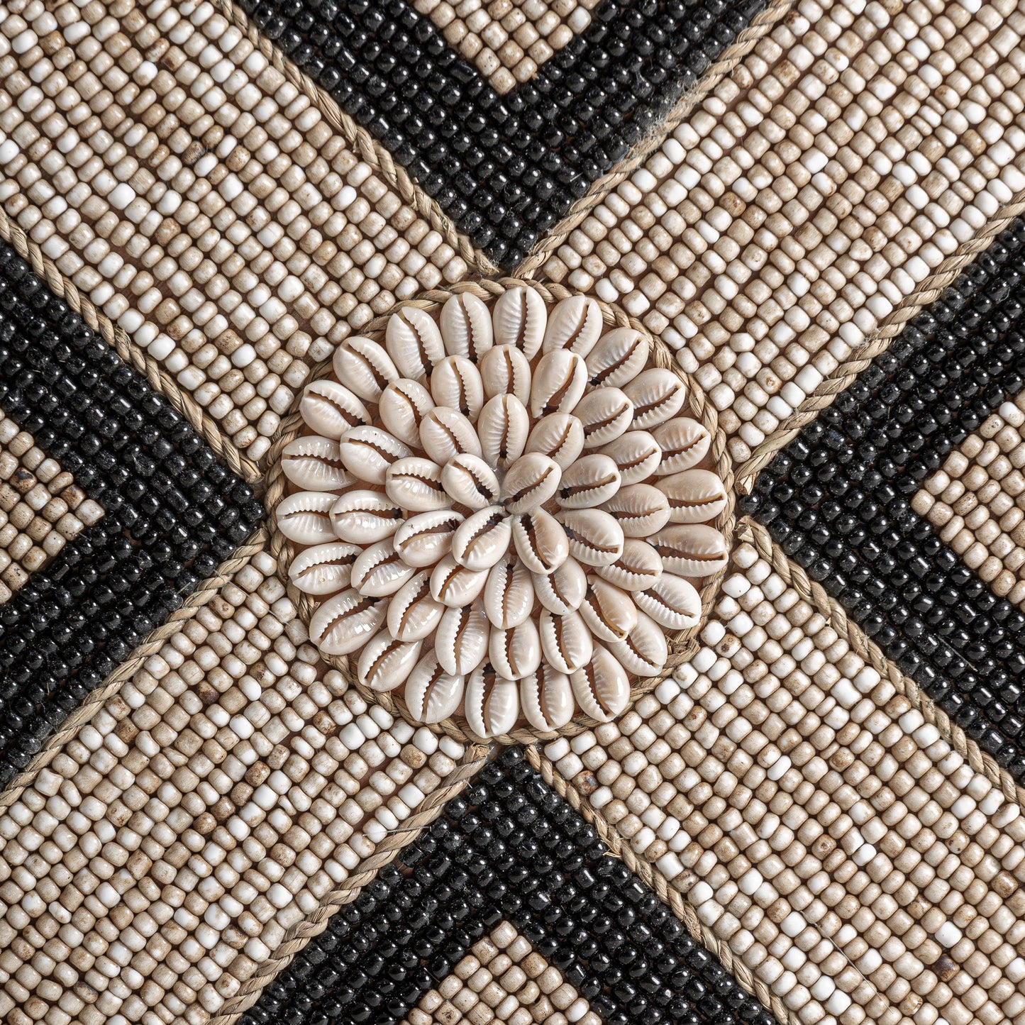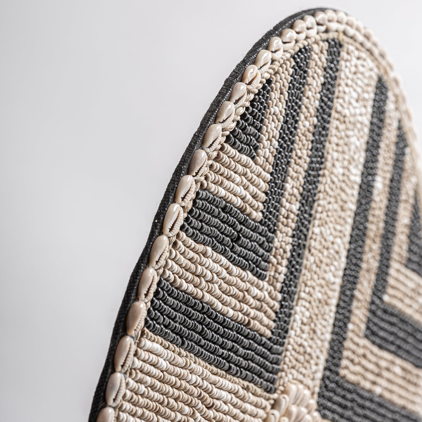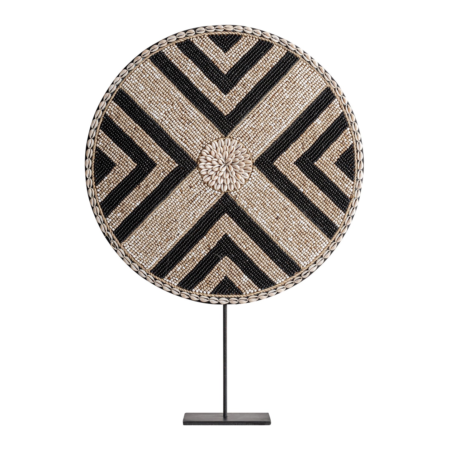 La pieza destaca por su honestidad constructiva, alejándose de imitaciones sintéticas. El cuerpo principal es un disco elaborado en fibra de bambú natural, que ofrece una superficie rica en matices y una textura táctil auténtica. Sobre esta base orgánica se dibujan patrones geométricos en negro que aportan ritmo y profundidad. Todo el conjunto descansa sobre una estructura de soporte en hierro con acabado negro mate, firme y arquitectónico, que eleva la pieza y genera un interesante juego de luces y sombras gracias a su silueta abierta.