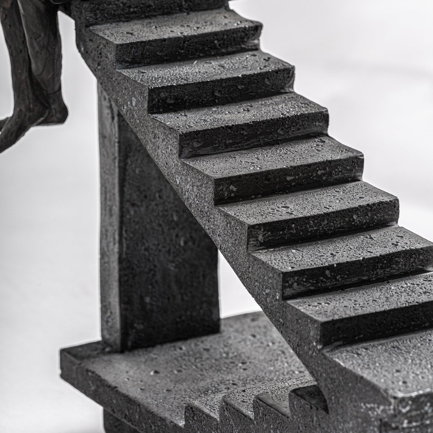 Olvídate de la percepción plástica de los materiales sintéticos convencionales. Esta pieza ha sido moldeada en una resina de alta densidad con un acabado negro mate profundo, diseñado para absorber la luz en lugar de reflejarla. Su superficie sólida y angulosa dibuja una silueta nítida que combina la estructura arquitectónica de unas escaleras con la fluidez abstracta de un cuerpo en contemplación. El tacto es firme y sustancial, transmitiendo una sensación de peso y calidad que confirma su vocación de pequeña obra de arte doméstico.