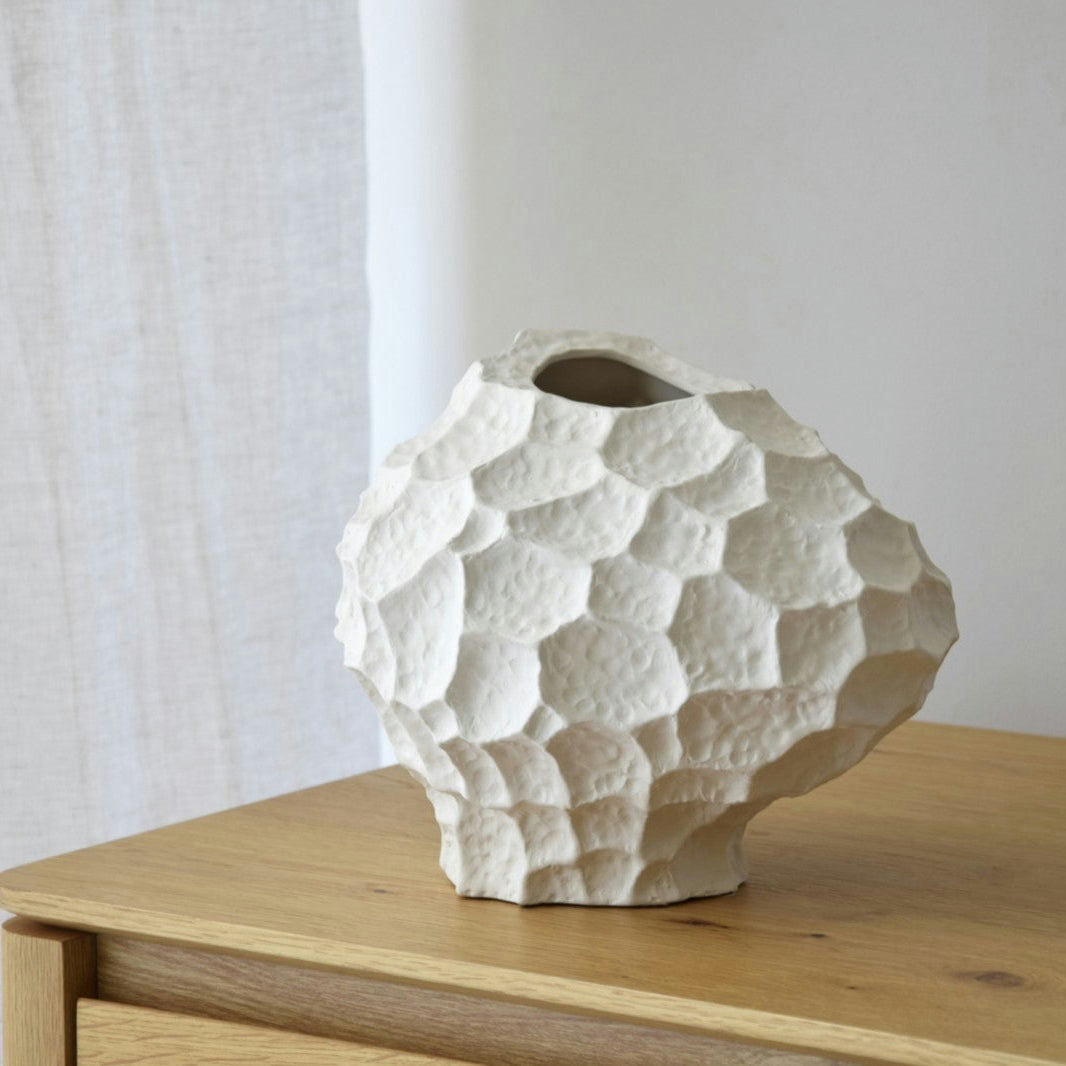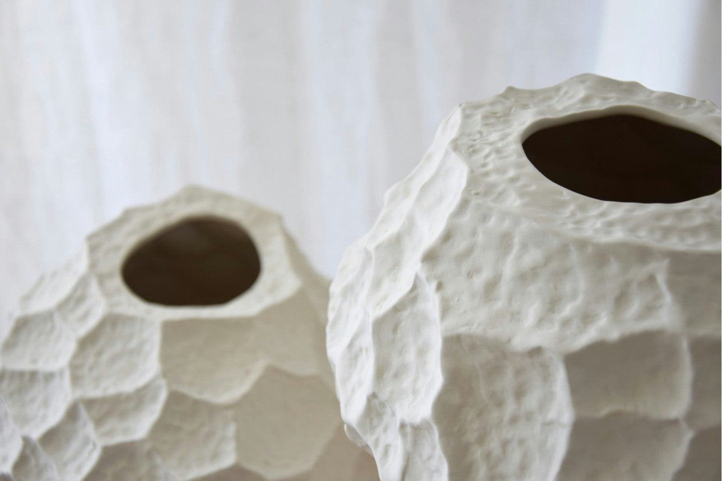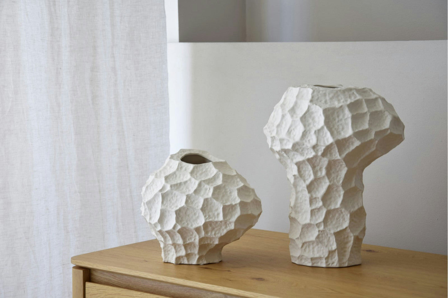 Elaborados con cerámica de alta calidad, estos jarrones presentan un acabado en elegante blanco que resalta sus relieves irregulares. La producción artesanal de cada pieza asegura que son únicos, ofreciendo una estética moderna y abstracta que se adapta a cualquier estilo de decoración, ya sea contemporáneo, clásico o natural. Estos jarrones no solo son duraderos, sino que su versatilidad permite integrarlos en diversos contextos de interiorismo.