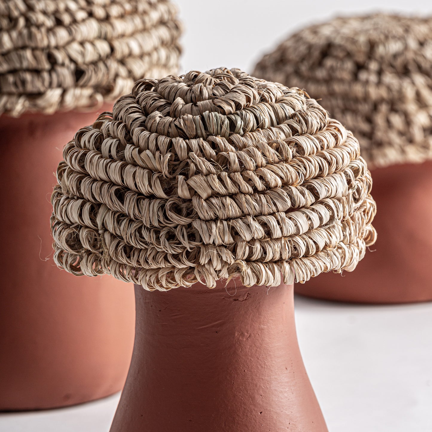 - Materiales: Terracota natural, fibra de rafia trenzada